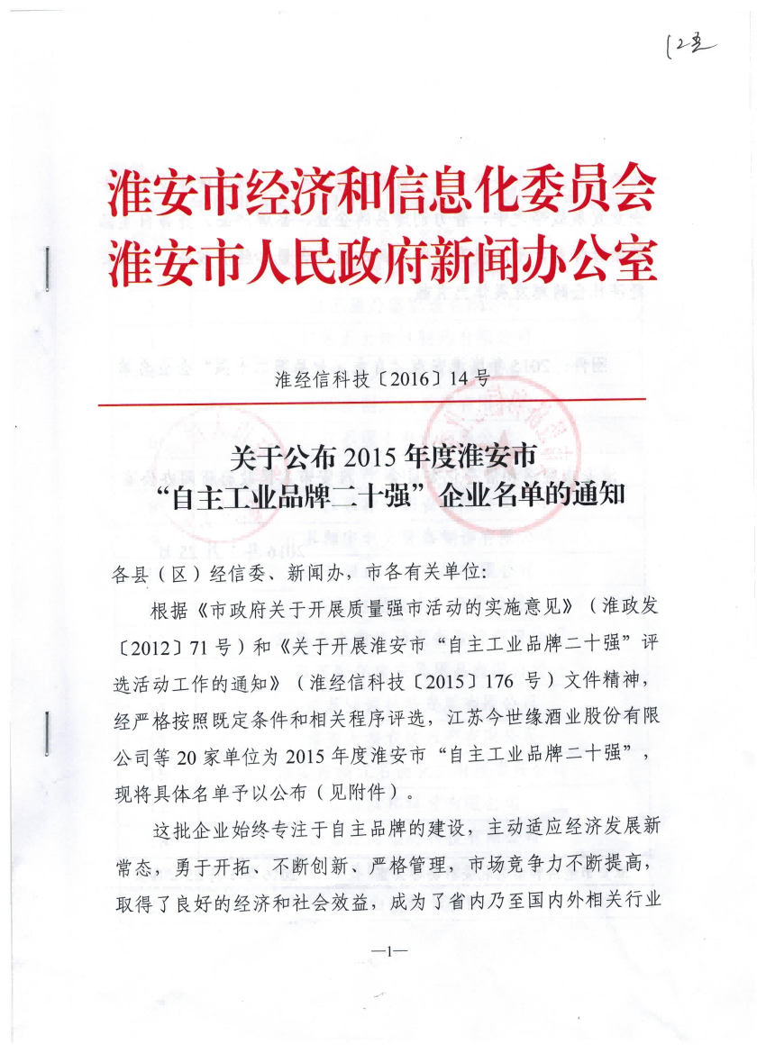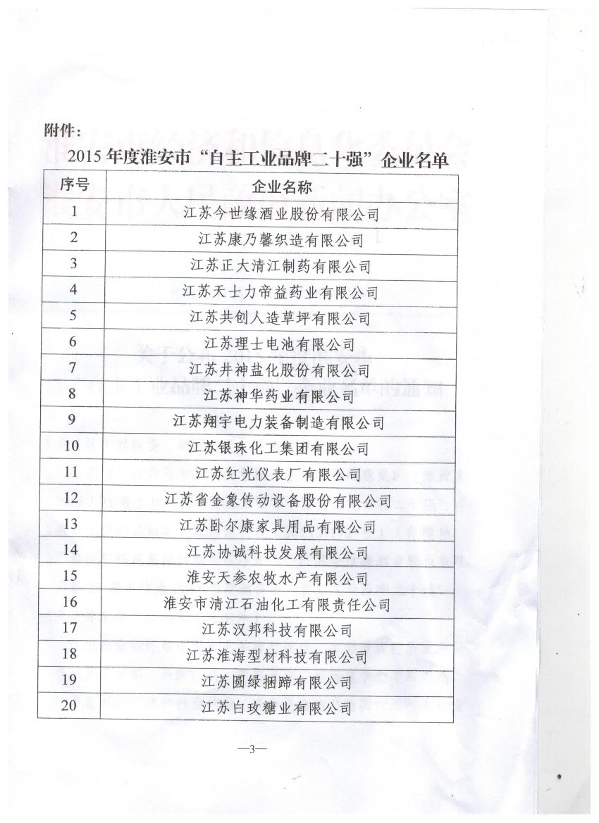 根據(jù)市政府評(píng)選,我公司被認(rèn)定為淮安市“自主品牌二十強(qiáng)”企業(yè)。“自主品牌二十強(qiáng)企業(yè)”是我市在國內(nèi)相關(guān)行業(yè)具有代表性并且競爭力較強(qiáng)的企業(yè),我公司名列第11名。